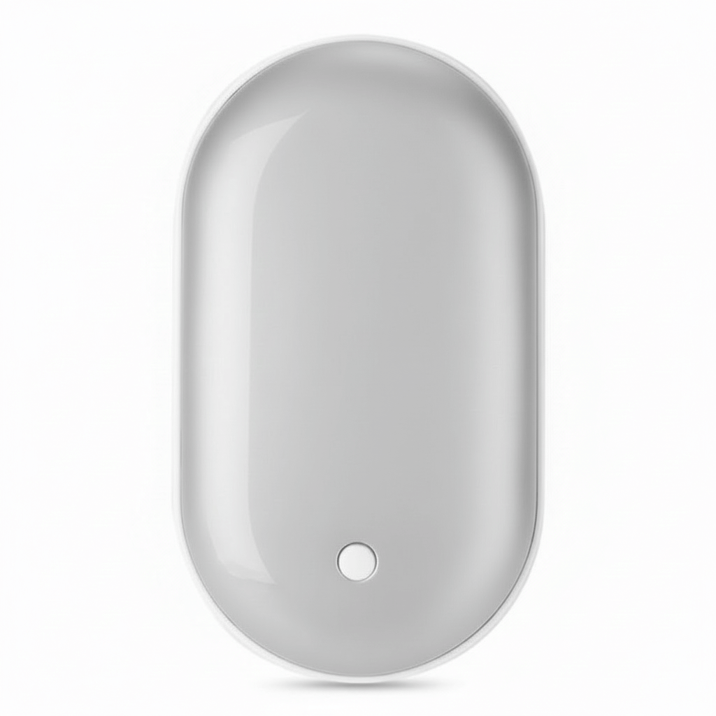 Silver Portable USB Hand Warmer Egg with a round button on a white background