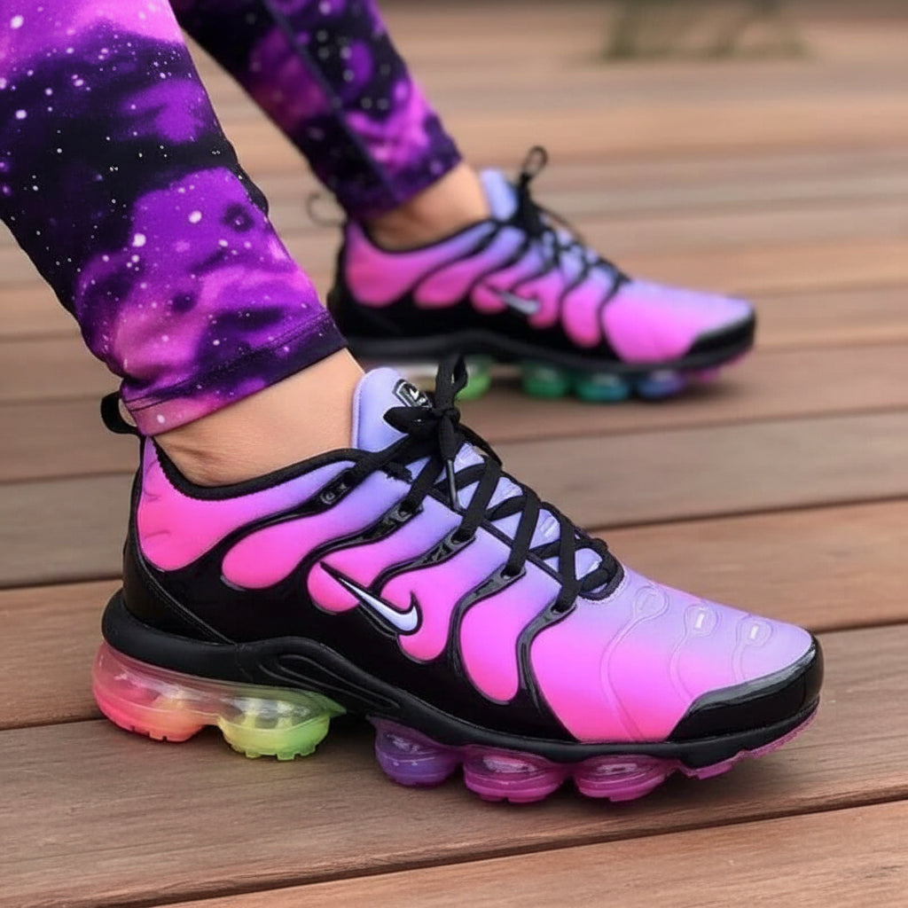 Colorful Women’s Running Shoes with a gradient design on a pavement background