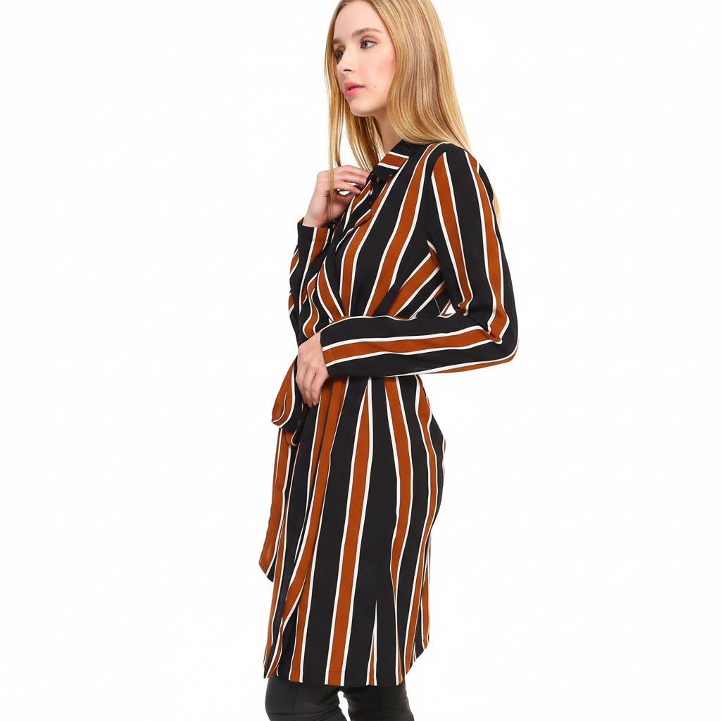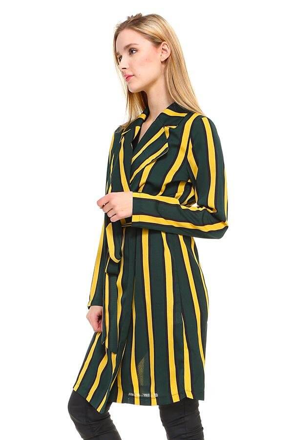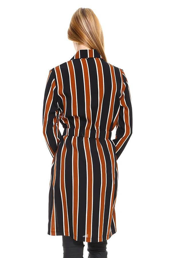 Model wearing the Multi Stripe Long Blazer | 100% Polyester | Stylish Fit with a stylish belt and striking stripes.